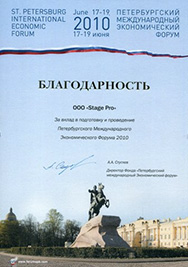Мы ценим Ваш профессионализм и неизменное качество работ, которое способствует проведению мероприятию в рамках Петербургского Международного Юридического Форума на неизменно высоком уровне. ООО «СтейджПро» зарекомендовало себя как надежный подрядчик, исполняющий заказы в установленные сроки. Позвольте выразить Вам признательность за Вашу работу и пожелать дальнейших успехов!