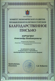 Комитет экономического развития, промышленной политики и торговли выражает благодарность Корчагину Александру Владимировичу (генеральному директору ООО "СтэйджПро") за активное участие в организации и проведении Международного экономического форума.