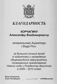 Выражает благодарность Корчагину Александру Владимировичу (генеральному директору ООО "СтэйджПро")за большой личный вклад в подготовку и проведение общегородских мероприятий, посвященных празднованию в 2009 году Дня города — Дня основания Санкт-Петербурга.