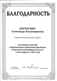 Выражает благодарность Корчагину Александру Владимировичу (генеральному директору компании "StagePro") за активное участие в организации и проведении праздника выпускников петербургских школ "Алые Паруса" в 2011 году.