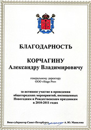 Выражает благодарность Корчагину Александру Владимировичу (генеральному директору ООО "StagePro") за активное участие в проведение общегородских мероприятий, посвященных Новогодним и Рождественским праздникам в 2010-2011 годах.