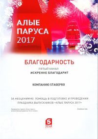 Искренне благодарим компанию StagePro за неоценимую помощь в подготовке и проведении праздника выпускников «Алые Паруса 2017».