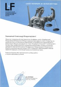 Общество с ограниченной ответственностью «Конференц-центр «Петербургский Междуанародный Юридический Форум» выражает благодарность ООО «СтейджПро» за оказанные услуги по техническому обеспечению VII Петербургского Международного Юридического Форума, прошедшего в г. Санкт-Петербурге с 16 мая 2017 г. по 20 мая 2017 г.